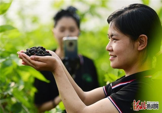 2020年4月28日,河北省贊皇縣蓮華山莊生態園里的管理人員在直播桑葚采摘線上銷售產品。蓮華農莊是集綠色產業農業、生態觀光采摘、農業科普于一體的現代農業產業園區。
