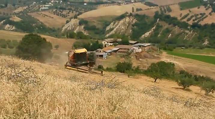 作業(yè)中的紐荷蘭山地聯(lián)合收割機(jī)在山坡打谷